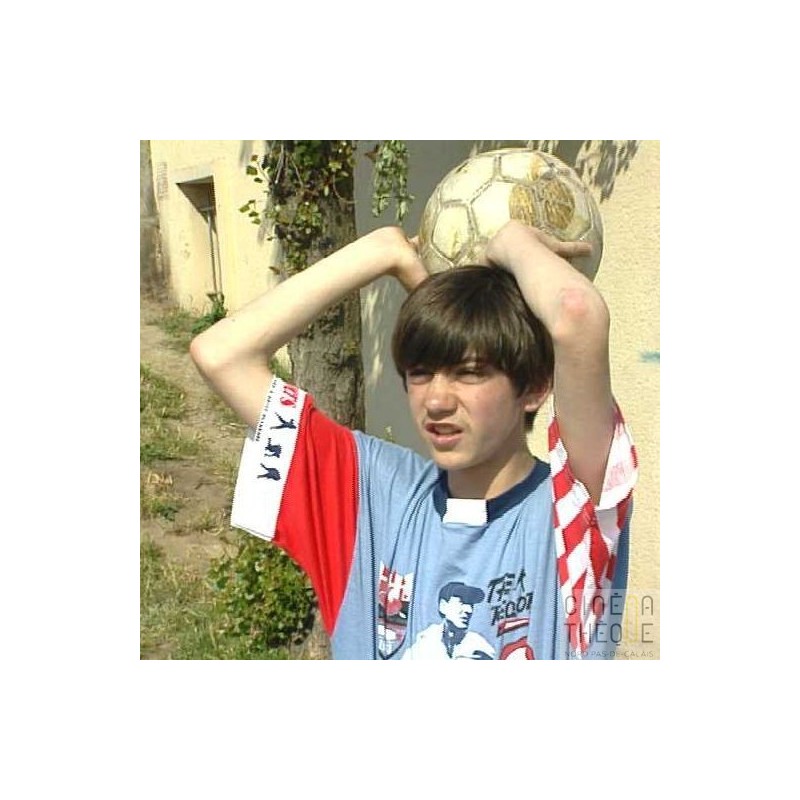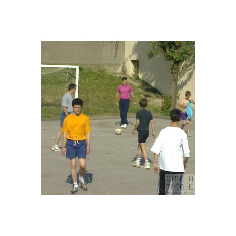 Plans de jeunes jouant au football sur un terrain attenant à un centre pour jeunes en difficulté (Maison des Enfants de la Marine) Ils font des amortis, des passes. L'un d'eux marque un but et laisse éclater sa joie.