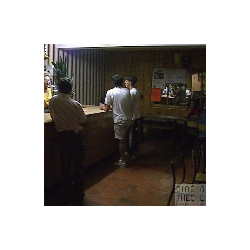 Bal Musette . On suit les discussions des clients d'Evelyne au bar . Service des clients par Evelyne à une table . Vue de la ducasse.