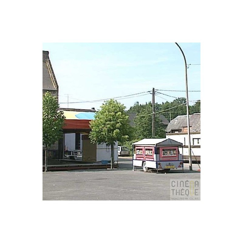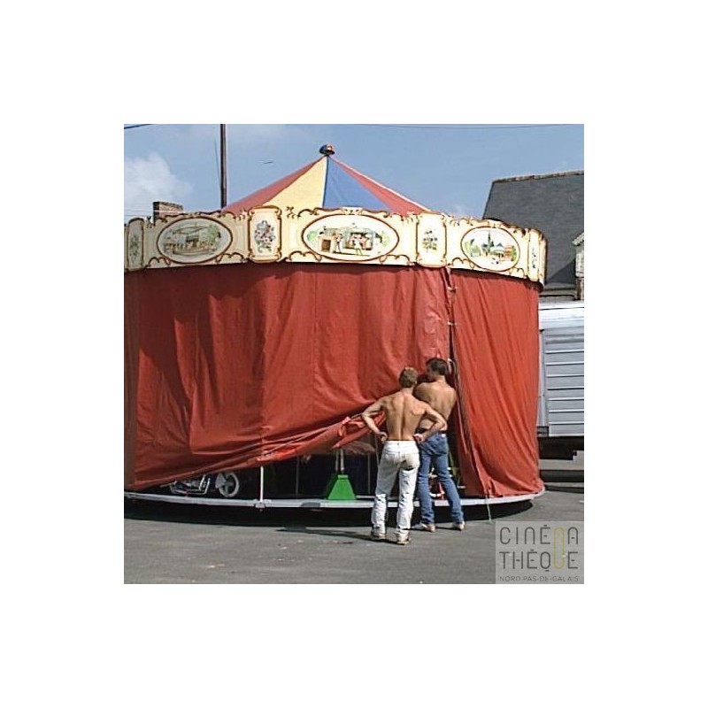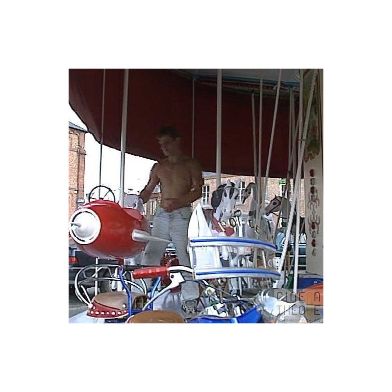 Préparation des manèges, installation de la vie foraine, nettoyage des manèges. Passage de voitures de collection . Vue du café 'Chez Evelyne' . Place de la ville et vue d'un château.
